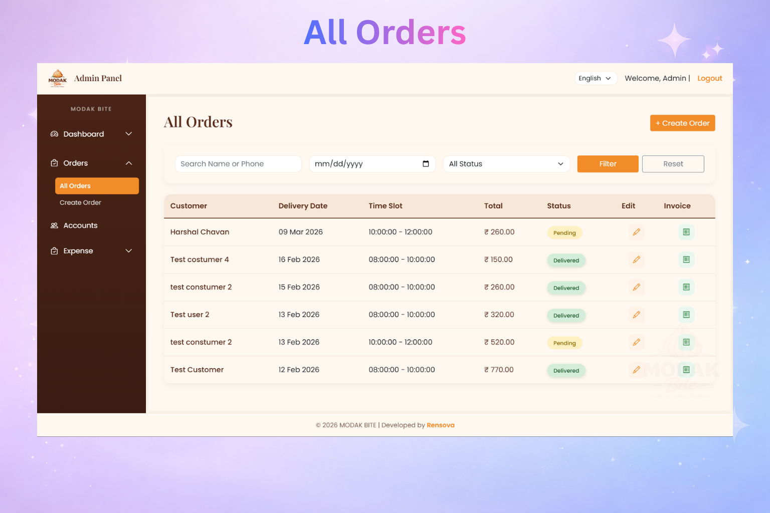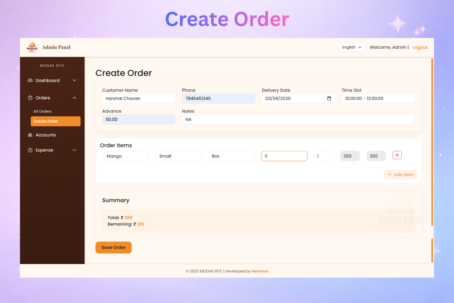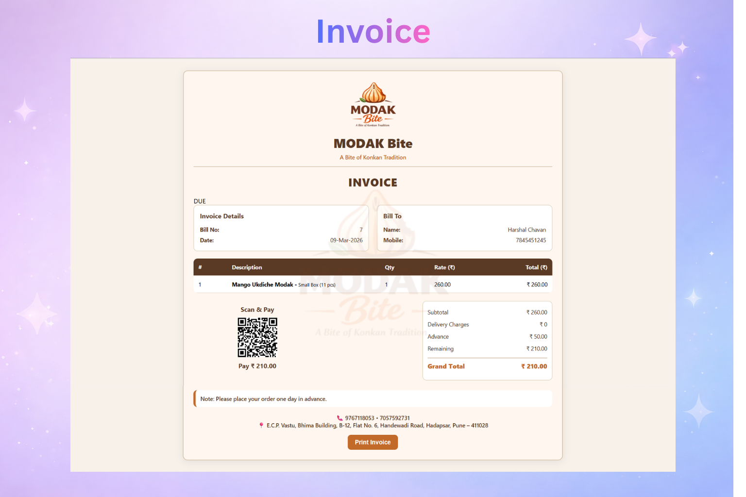 Modak Bite is a custom-built admin platform developed to streamline operations for a family-owned modak business. The system centralizes order management, accounting records, invoice generation and reporting through a single dashboard.