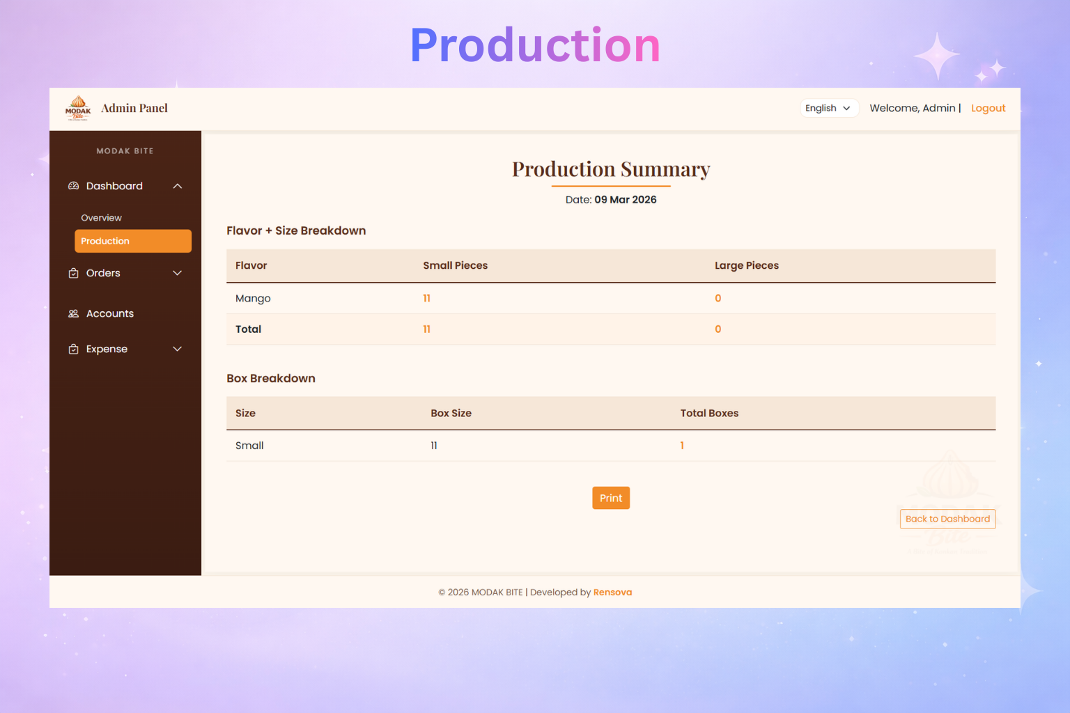 Admin dashboard for managing orders, accounting, invoices and daily operations for a modak business.